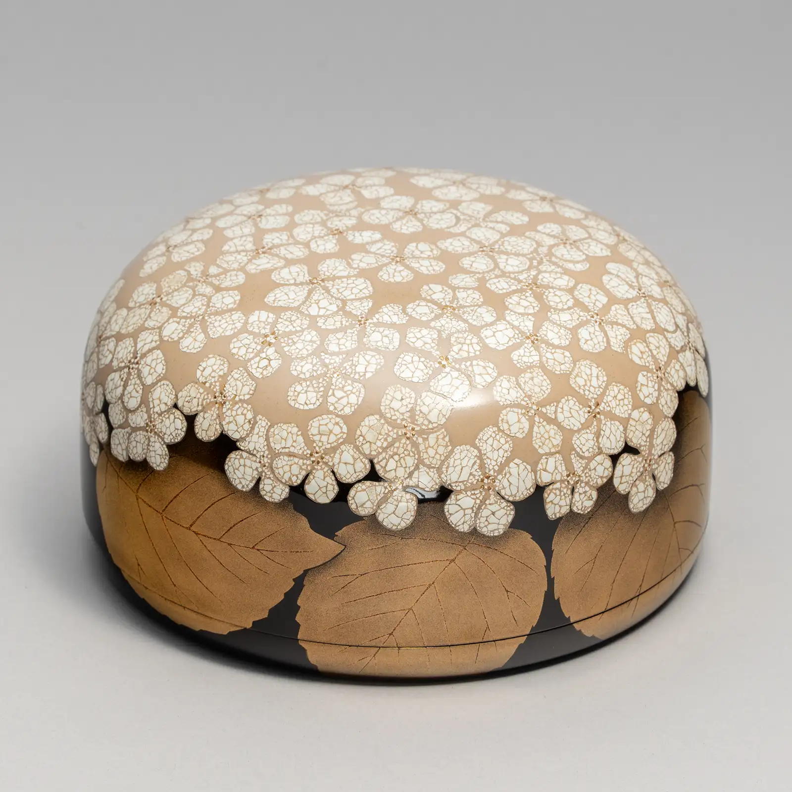 〜室瀬 祐先生からみなさまへ〜 庭で育てた大手毬、その優しくも堂々とした存在感をテーマに乾漆の合子を制作しました。 白い花は、ウズラの卵を切り貼りする卵殻という技法によるもの。漆面を彫って異素材を嵌める象嵌によって輪郭を際立たせ、花びら一枚一枚に異なる表情を持たせました。蕊を金粉で描き、周囲には研出蒔絵で生い茂る葉を表しています。卵殻と蒔絵、花と闇――二つの世界が交わり溶け合う情景を描きました。